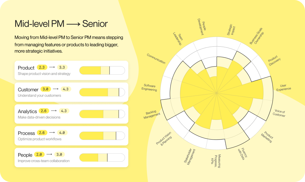 Practical guide to progression as a product manager. See how responsibilities change from Associate PM to CPO. Includes PM skill requirements by level and resources to level up.
